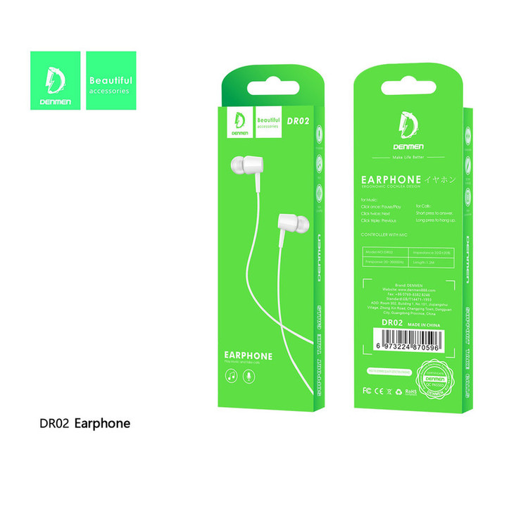 هندزفری «DR02» محصولی از شرکت «دنمن» است که از طریق جک 3.5 میلیمتری صدا به تلفنهمراه متصل میشود. این هندزفری طراحی بسیار سادهای دارد ولی صدای تولیدی آن بسیار با کیفیت است. هنگام گوش کردن به موسیقی توسط هندزفری دنمن مدل «DR02» شاهد بیس بسیار خوب در آن خواهیم بود. کابل این هندزفری دارای روکش پلاستیکی و با طول 1.2 متر است که مقدار بسیار مناسبی به شمار میرود. روی گوشیهای این محصول سرگوشیهای سیلیکونی تعبیه شده است که بسیار نرم و با کیفیت هستند. این سرگوشیها باعث میشوند که هندزفری به خوبی در گوش قرار گیرد. همچنین از نشر صدا به محیط بیرون جلوگیری میکنند. شرکت دنمن یک پنل شامل کلید و میکروفن روی کابل «DR02» تعبیه کرده است. به کمک میکروفن و کلید تعبیه شده میتوان به تماسهای تلفنی پاسخ داد. هندزفری «DR02» وزن بسیار کمی دارد و هنگام قرارگیری روی گوش باعث ایجاد مزاحمت نمیشود.