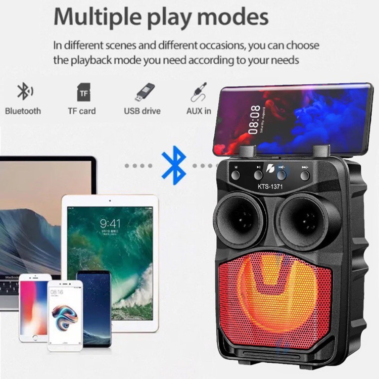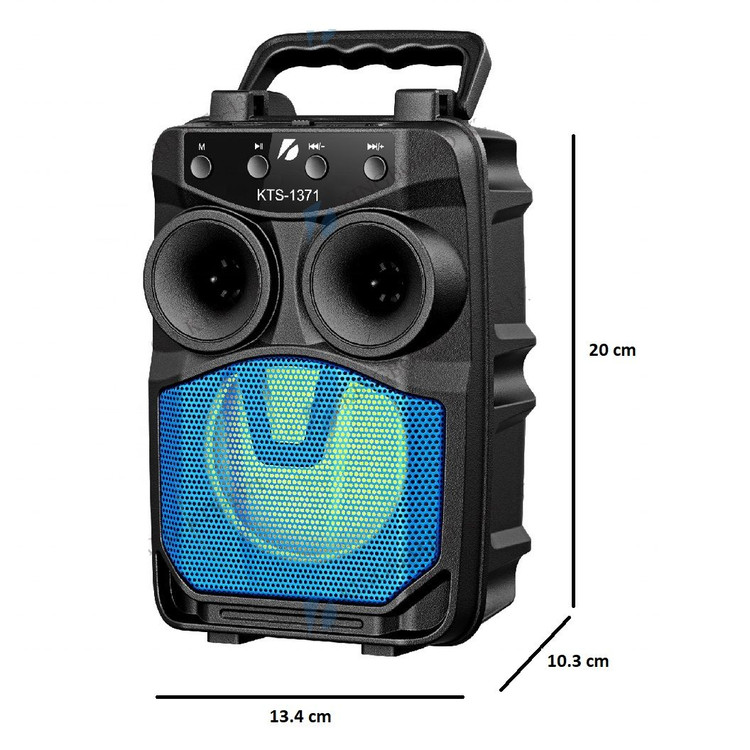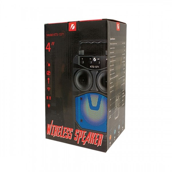 معرفی : اسپیکر بلوتوث شارژی KTS-1371 با بدنه ای مقاوم و ابعاد جمع و جور ساخته شده است و یک دسته نیز بر روی آن تعبیه شده تا حمل و جابجایی این دستگاه برای کاربر راحت تر باشد. همچنین یک محفظه به عنوان استند جهت قرار دادن گوشی موبایل نیز در قسمت بالایی پنل درنظر گرفته شده تا از گوش دادن به آهنگ های موردعلاقه خود با خیالی آسوده لذت ببرید. این دستگاه پخش کننده صوتی از اتصال بی سیم نیز پشتیبانی می کند و از طریق بلوتوث به گوشی های موبایل، تبلت و … تا شعاع ۱۰ متری بدون تاخیر و باکیفیت بالایی در پخش صدا متصل می شود. علاوه بر این درگاه کارت حافظه رم میکرو SD و همچنین پورت فلش مموری USB نیز وجود دارد تا دسترسی به دیگر فایل های صوتی ذخیره شده امکانپذیر باشد.حتی خروجی صدایی برای اتصال میکروفن به این اسپیکر وجود دارد که صدای خود را در آن پخش کنید. این اسپیکر بی سیم به قابلیت TWS نیز مجهز شده که اتصال ۲ عدد از این اسپیکر هم نوع را به یک دستگاه واحد بلوتوثی برقرار می کند تا آهنگ در حال پخش با صدایی قدرتمندتر به صورت همزمان از هر دو اسپیکر به گوش برسد. یک سری دکمه های فیزیکی نیز بر روی پنل این اسپیکر پرتابل قرار گرفته تا مدیریت بر روی پخش موسیقی، تنظیم ولوم، Mode و … در دسترس کاربر باشد.