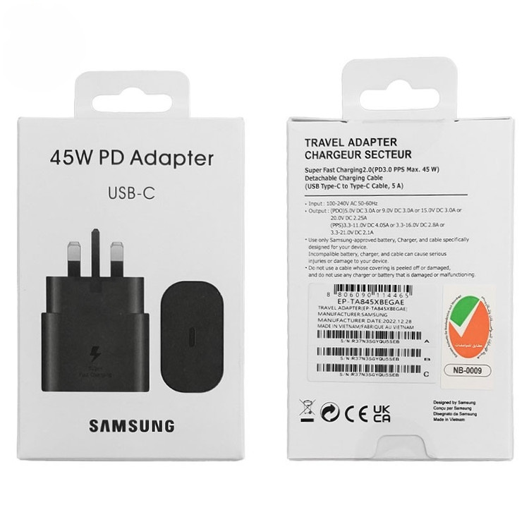 این شارژر مجهز به تکنولوژی Super Fast Charge A+ است که بر روی مدل SAMSUNG S23 Ultra عمل می کند و سرعت شارژ به نسبت بالاتری نسبت به دیگر 45 وات ها دارد. این محصول ، از بردی نسل جدید که ساخت سال 2023 است بهره میبرد که تصویر این درج بر روی کلگی را می توانید در آلبوم تصاویر مشاهده بفرمایید.